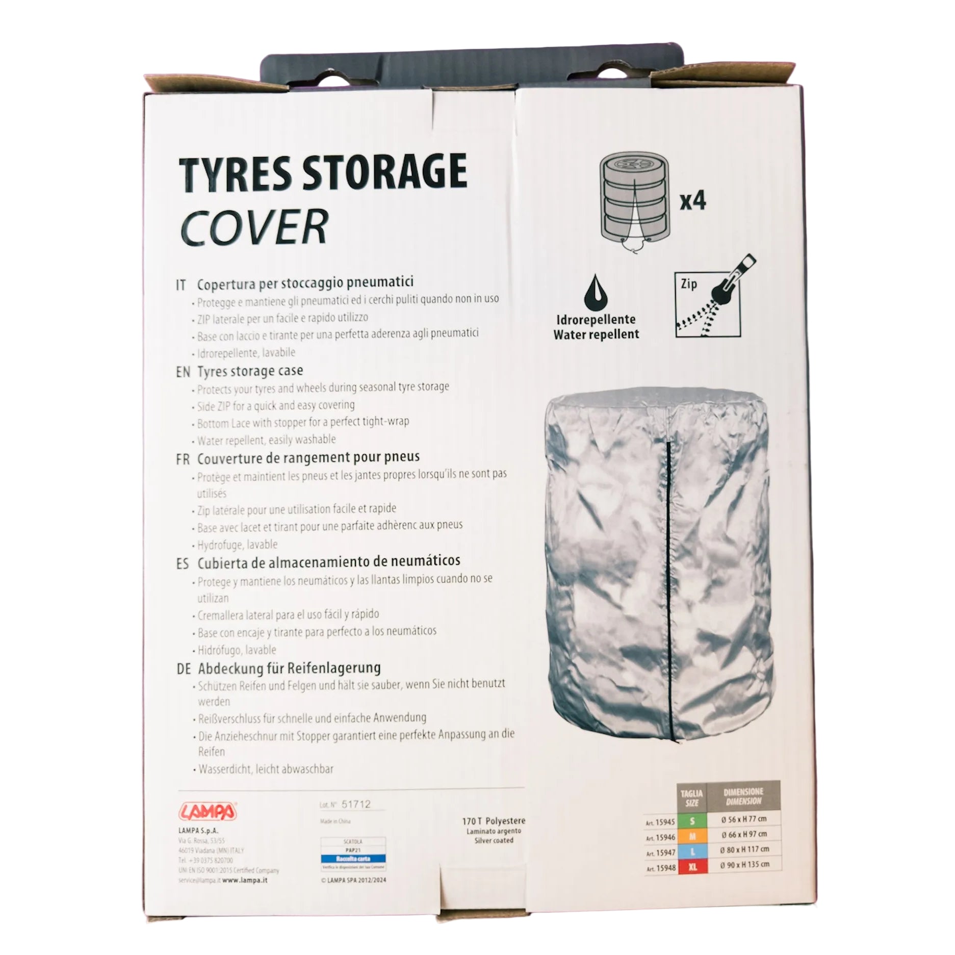 • Protezione efficace: il copripneumatici Lampa è pensato per custodire e proteggere fino a quattro ruote auto impilate durante i periodi di inutilizzo, sia in garage che in magazzino.