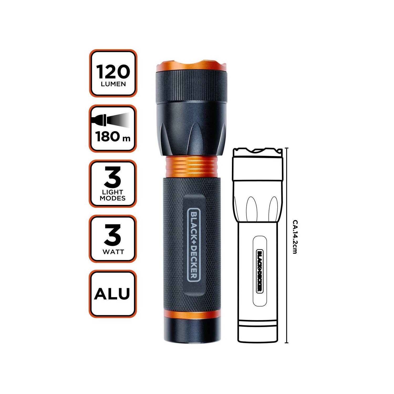Výkonná LED svítilna Black+Decker nabízí světelný tok 120 lumenů a dosvit až 180 metrů, takže spolehlivě osvítí i vzdálenější okolí. Je ideálním parťákem na túry, kempování, venkovní aktivity nebo jako praktická pomůcka při výpadku proudu.